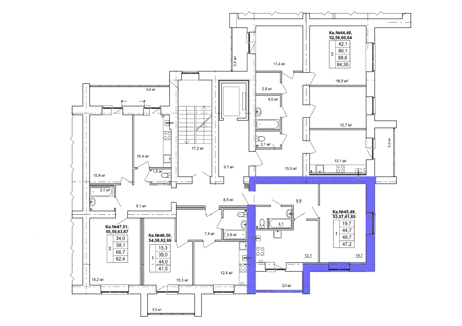 1-комн. квартира № 45 пл. 49,7 м²
