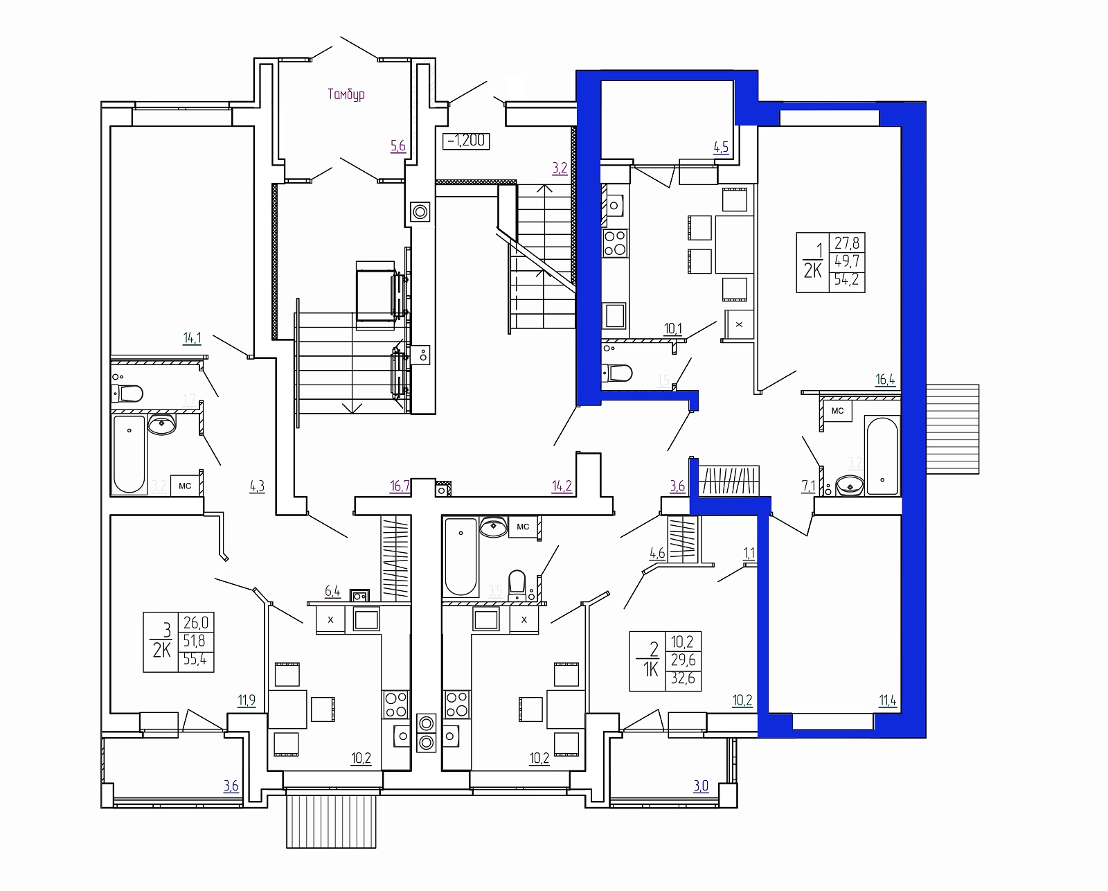 Продается 2-комн. квартира № 1 пл. 54,2 м²